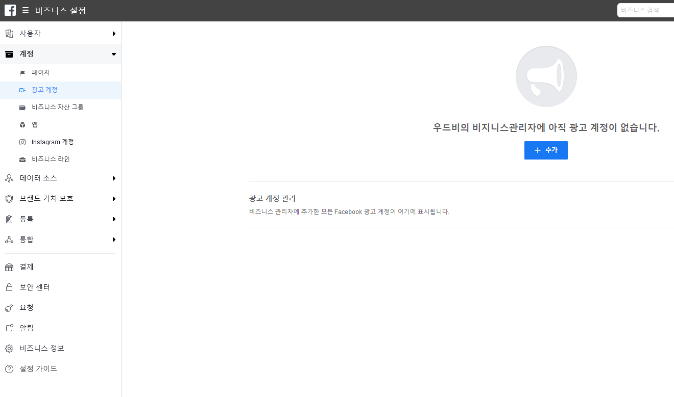 계정 -> 광고 계정을 누르면, 파란색 버튼으로 [+추가] 라고 되어있습니다. 클릭해봅니다.